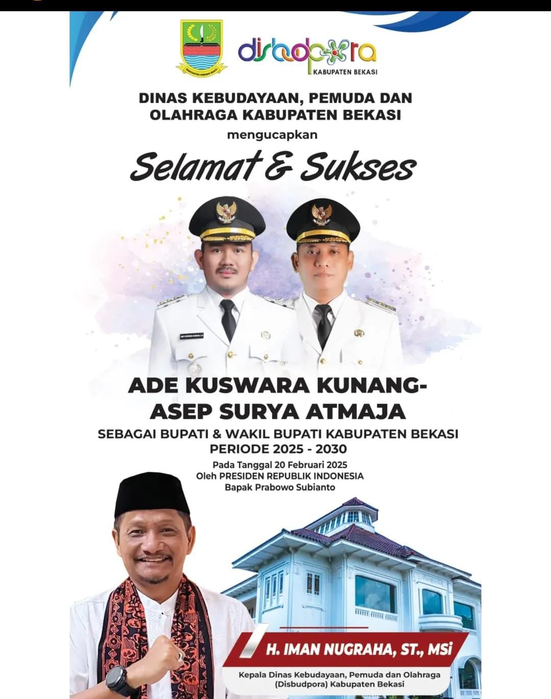 Dinas Kebudayaan Pemuda Dan Olahraga Kabupaten Bekasi Mengucapkan Selamat Atas Pelantikan Bupati Dan Wakil Bupati Kabupaten Bekasi Periode 2025-2029